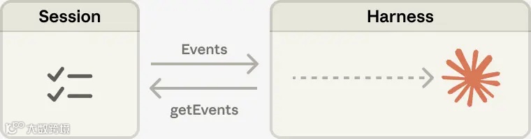 的 append-only 日志,存在容器和 harness 之外,任何组件崩了都不影响它。getEvents() 这个接口可以让 harness 按需拉取日志,任意切片——从上次停的地方继续读,或者往前几条看上下文。这解决了上下文窗口的跨越问题:会话不是 Claude 的上下文窗口,而是一个存在外部、可以被 Claude 按需访问的记忆对象。