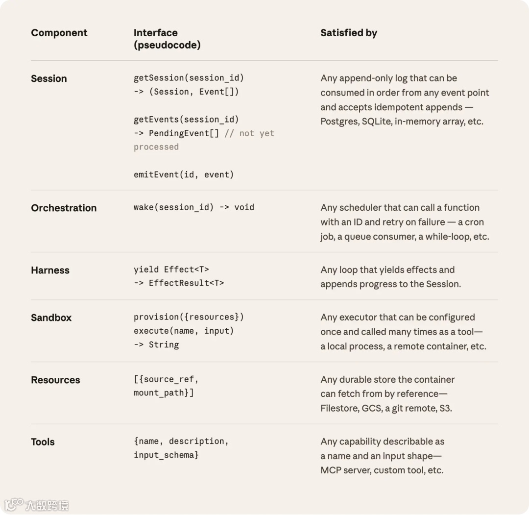 Managed Agents 用了同一套思路。把 Agent 拆成三个独立的组件,每个组件对外只暴露接口,内部实现可以随时替换: