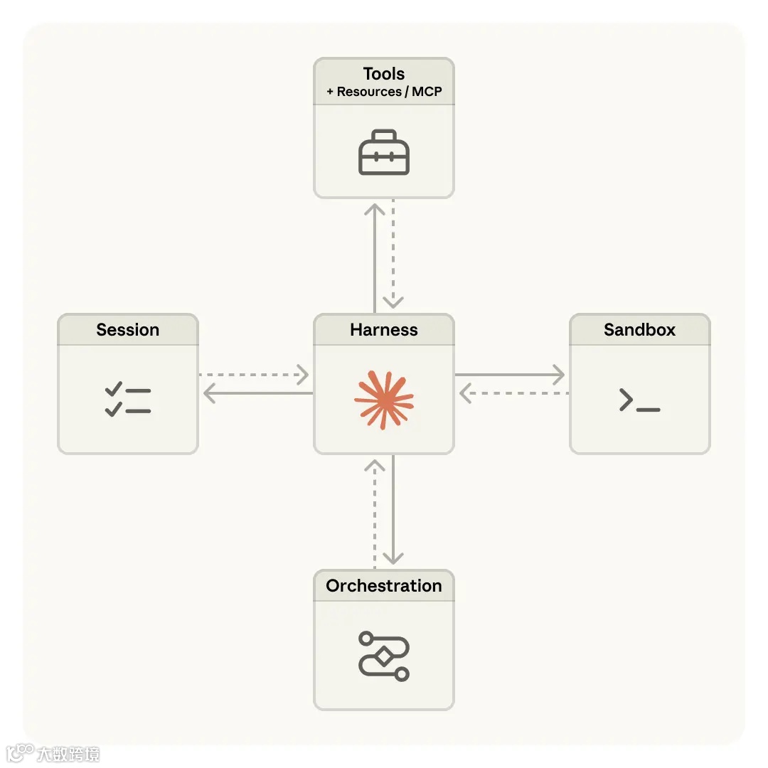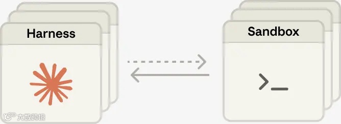 ),从容器里移了出去。它调用沙箱的方式和调用任何工具一样:execute(name, input) → string。沙箱崩了,harness 收到的是一个工具调用错误,可以传给 Claude 判断是否重试。Harness 自己崩了,新的 harness 实例用 wake(sessionId) 唤醒,getSession(id) 拿回日志,从最后一个事件继续跑。