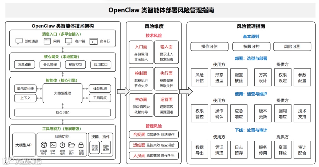 图:OpenClaw类智能体技术架构与风险管理全景图