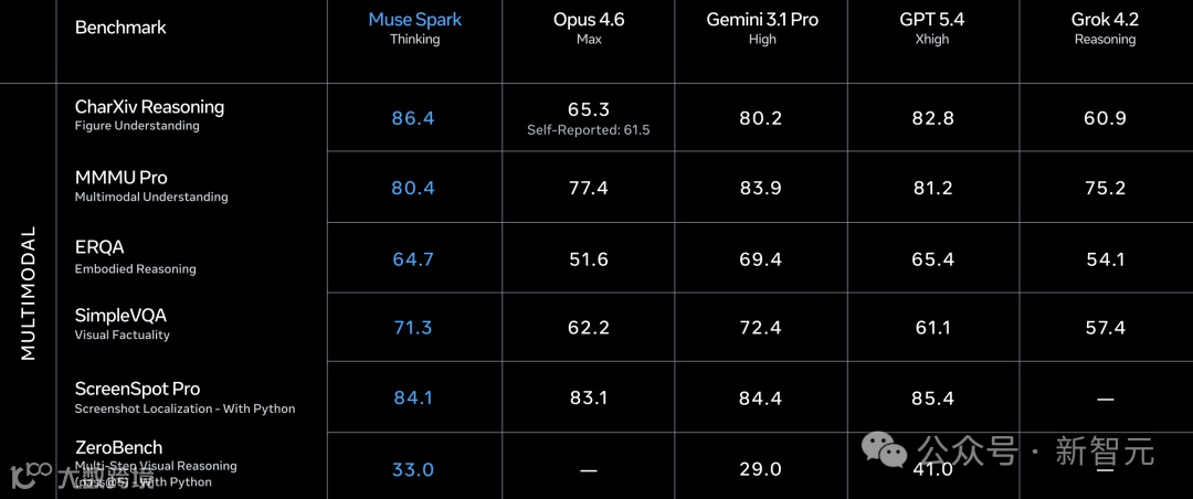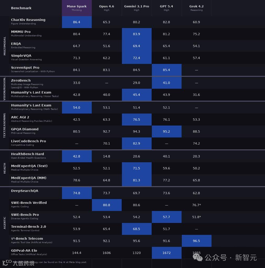 Meta把Muse Spark(Thinking模式)和Opus 4.6、Gemini 3.1 Pro、GPT 5.4、Grok 4.2放在一起比了个遍,覆盖多模态、文本思考、健康、Agent四个维度,总共20多个benchmark。