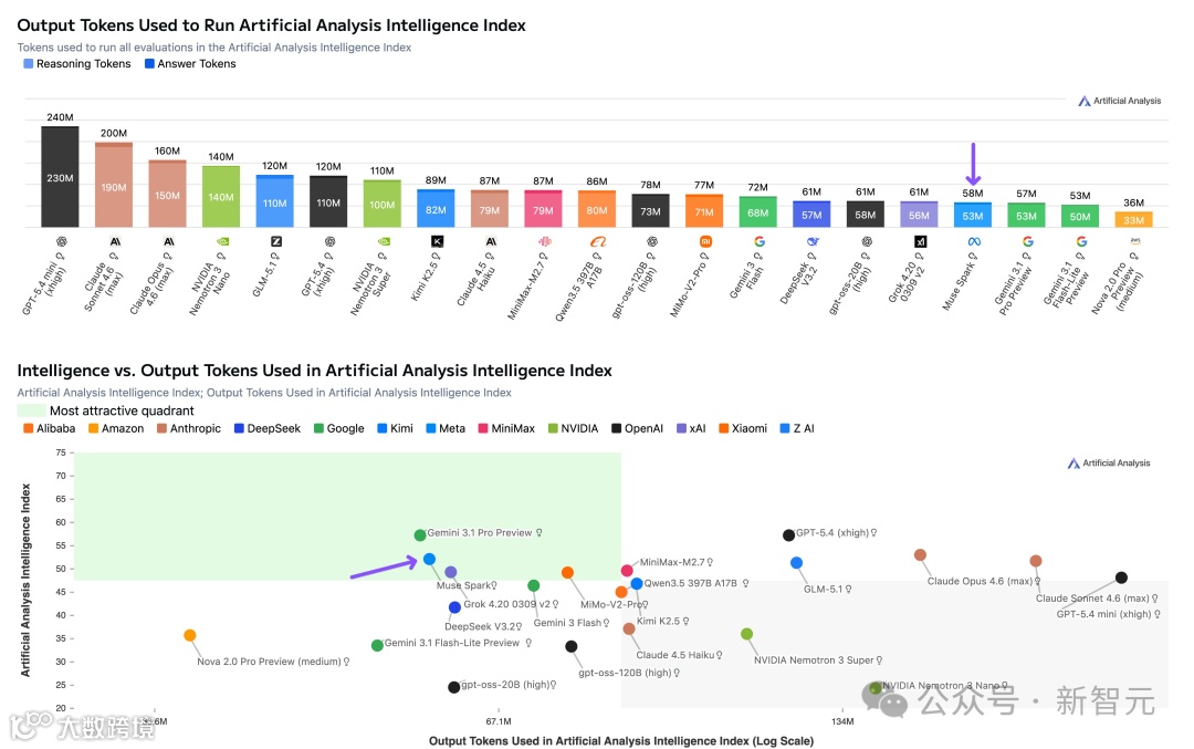 跑完整个Intelligence Index测试套件,Muse Spark用了5800万输出Token,和Gemini 3.1 Pro(5700万)相当,但远低于Opus 4.6(1.57亿)和GPT-5.4(1.2亿)。