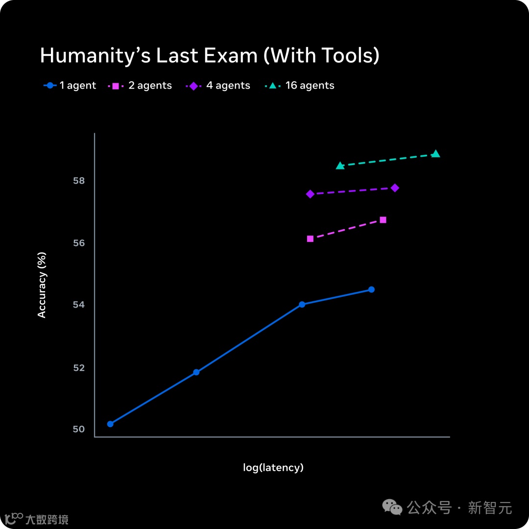 Meta的做法是扩展并行Agent数量,1个、2个、4个、16个Agent同时思考。