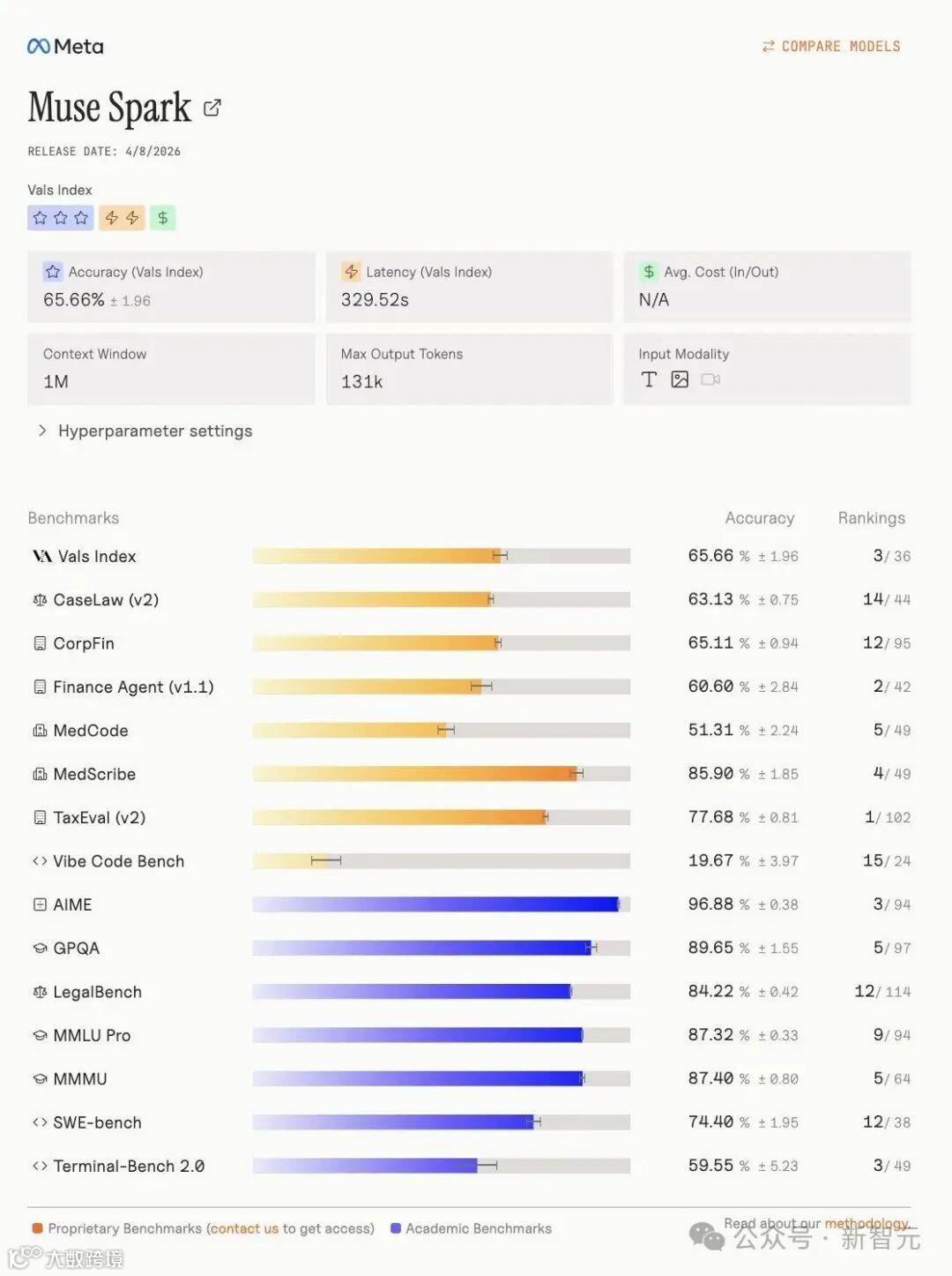 更值得一提的是,在Vals指数排行榜上,Muse Spark强势夺得第三名,具体指标如下。