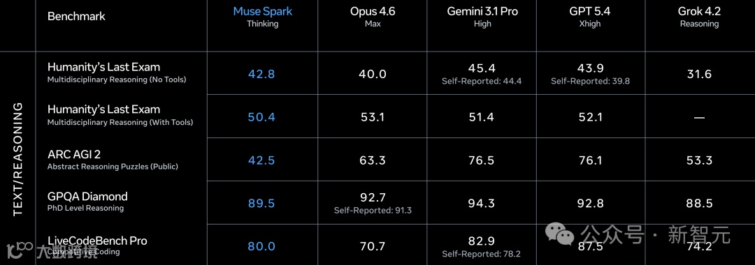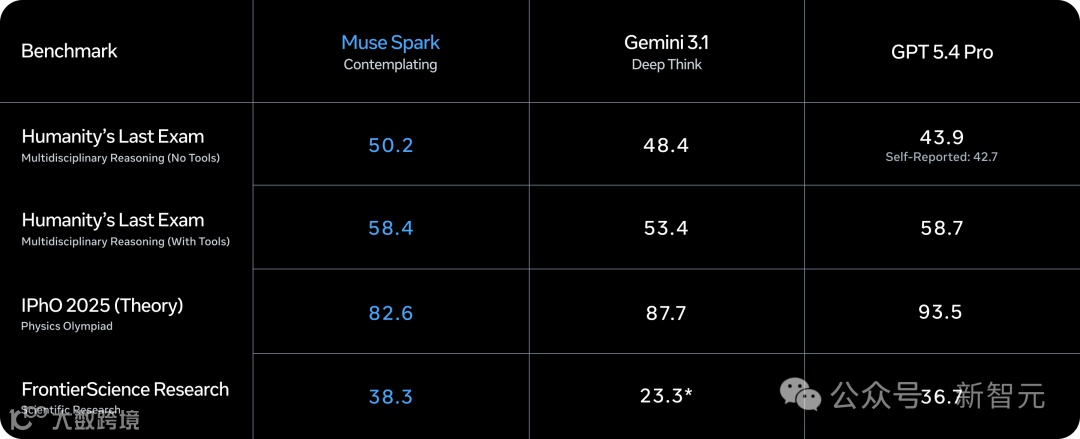 Humanity's Last Exam(无工具),Muse Spark沉思模式拿了50.2,Gemini Deep Think 48.4,GPT 5.4 Pro 43.9。