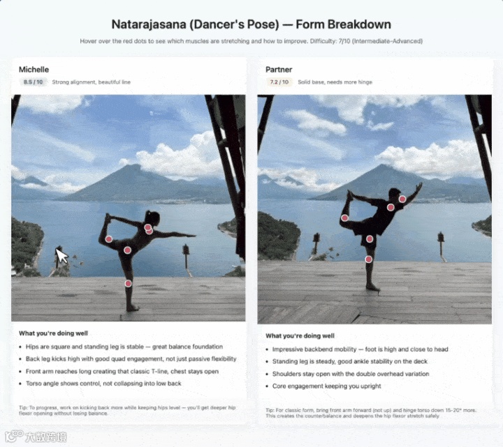 它识别出每个姿势拉伸了哪些肌肉群,标注难度级别,悬停后还能给出体态纠正建议。两个人的图左右拼在一起,按1到10分分别打分。