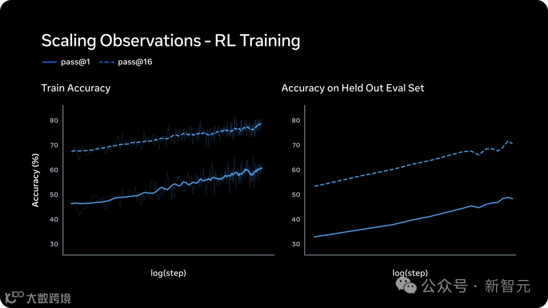 左图是训练集上的表现。pass@1和pass@16(16次尝试中至少对1次)都呈对数线性增长。