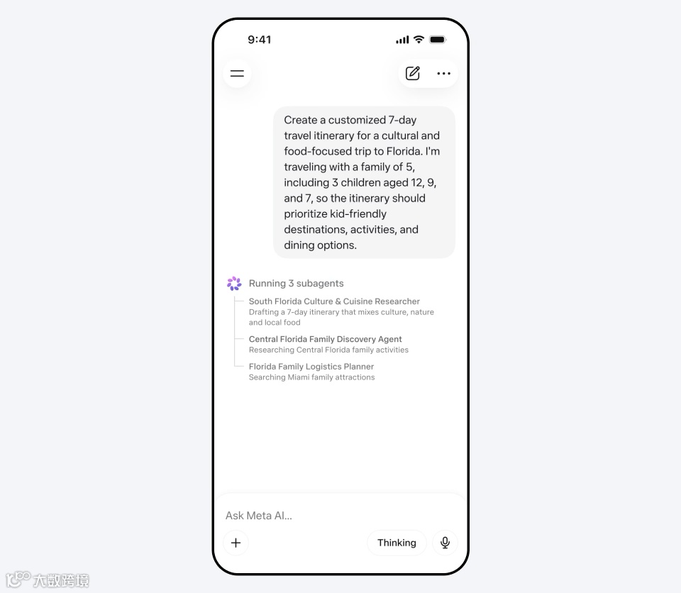 只需输入「帮我规划一个5口之家去佛罗里达的7天文化美食行程,3个孩子分别12、9、7岁」,Muse Spark就会同时派出三个子Agent,一个规划美食文化路线,一个搜索亲子活动,一个协调物流和住宿