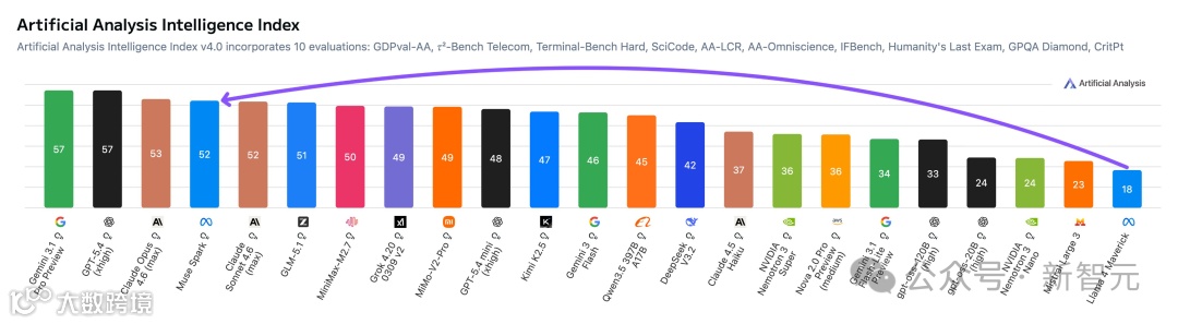 【导读】太猛了!Meta超级智能实验室沉寂9个月,首个大作Muse Spark深夜炸场。跑分直接从18飙到52,盘中暴涨10%,小扎这143亿美元花得太值了。