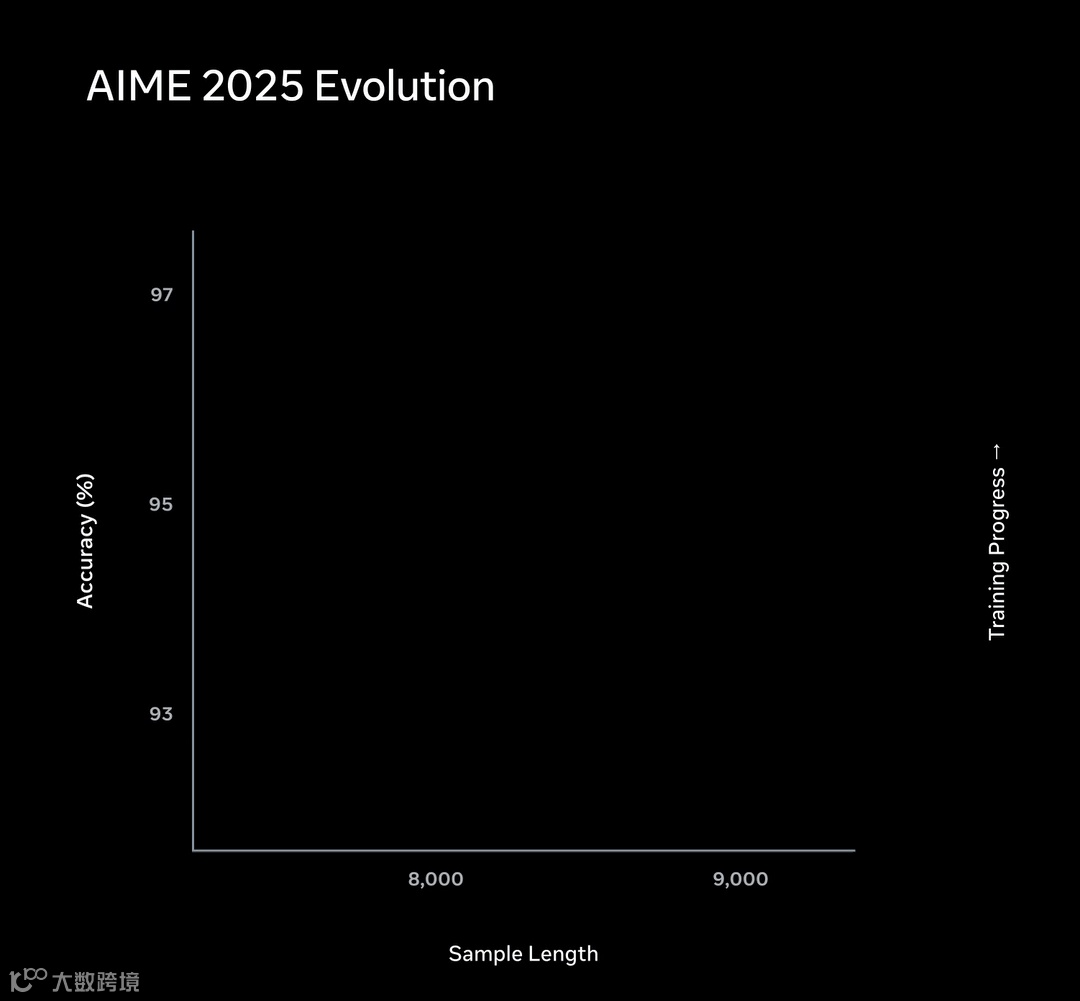 AIME子集上的表现是这样的,训练早期,Muse Spark通过想更久来提升正确率,曲线向右延伸。