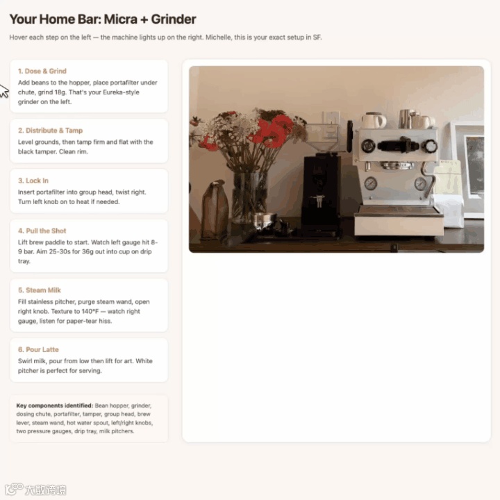 拍咖啡机和磨豆机,它先标出所有核心部件,然后生成一份网页版互动拿铁教程。