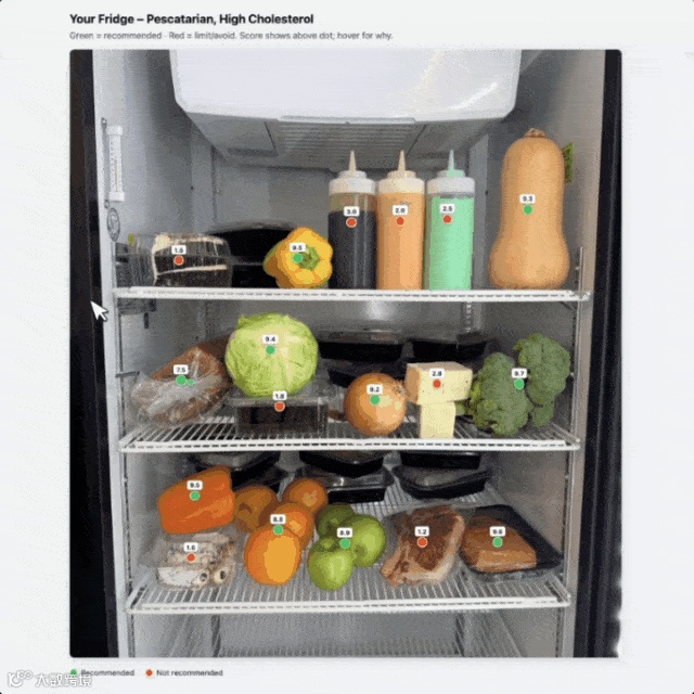 拍一桌子食物,告诉它「我胆固醇偏高,是鱼素者」,Muse Spark会在推荐的食物上打绿点,不建议的打红点。