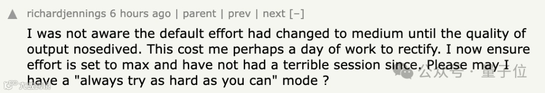 在输出质量断崖式下跌之前,我完全不知道默认effort已经被改成了Medium。为了纠正这些问题,我大概花了一整天的工作时间。现在我会确保把effort设为最高,从那以后就再也没出现过糟糕的对话了。能否给我一个“永远拼尽全力”的模式?