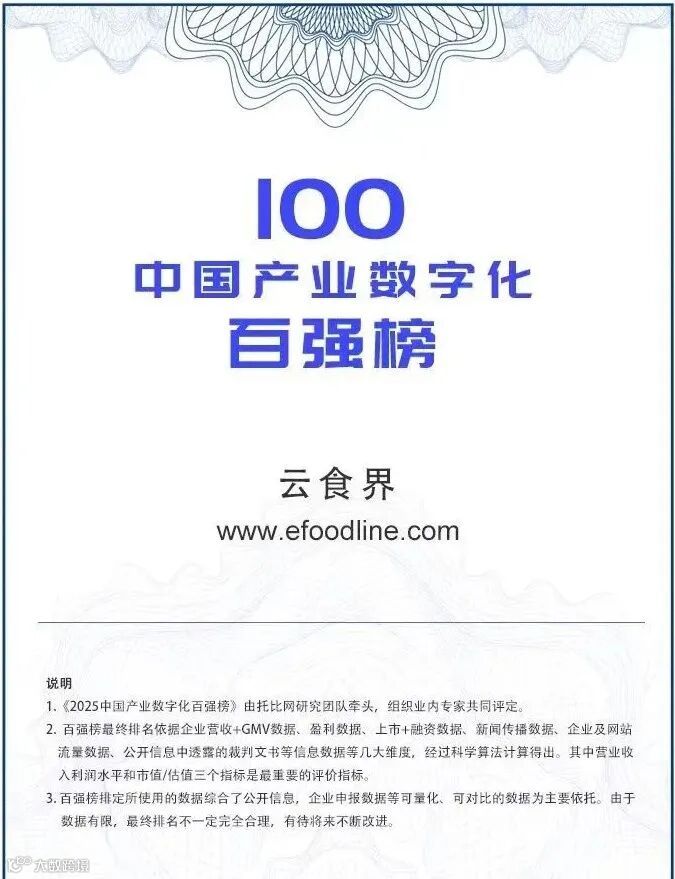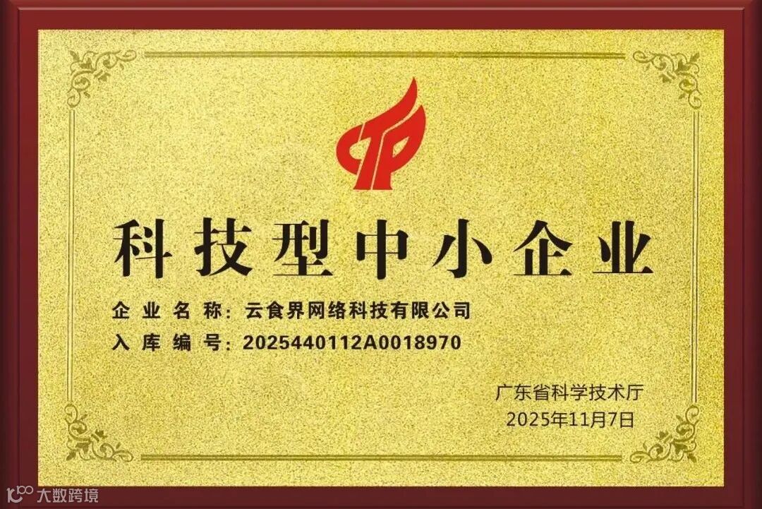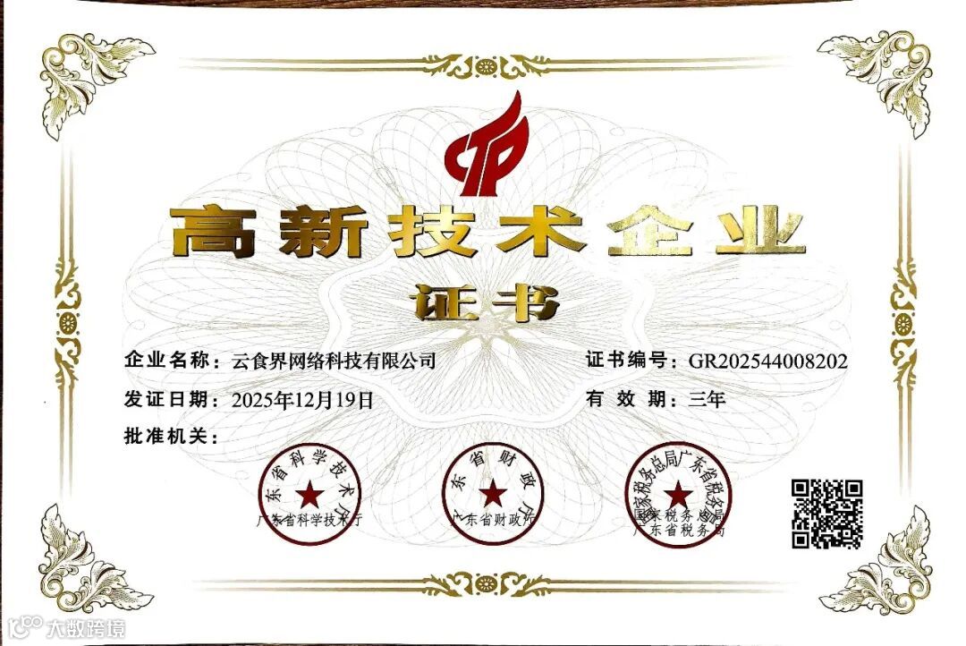 云食界的行业地位、服务能力与创新成果,获得行业机构及市场的高度认可。先后荣获服贸会“发展潜力服务示范案例”、国际商报社“2025数字商务创新发展实践案例”、中国产业互联网领军企业、2025中国产业数字化百强榜等重磅荣誉;获评广东省2025年高新技术企业,入选广东省2025年科技型中小企业库,科技创新实力获得官方权威认证。