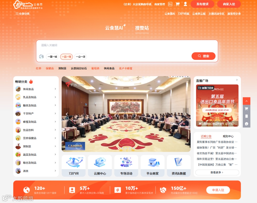 此外,云食界还通过品牌活动和渠道对接持续深化服务。连续多年举办的年货节已成为行业品牌活动,第五届年货节线下打造进口食品、出口转内销、金牌年菜三大特色展区,实现“即展即销”,并现场发布《云食慧AI助力粤味出海专项计划》。