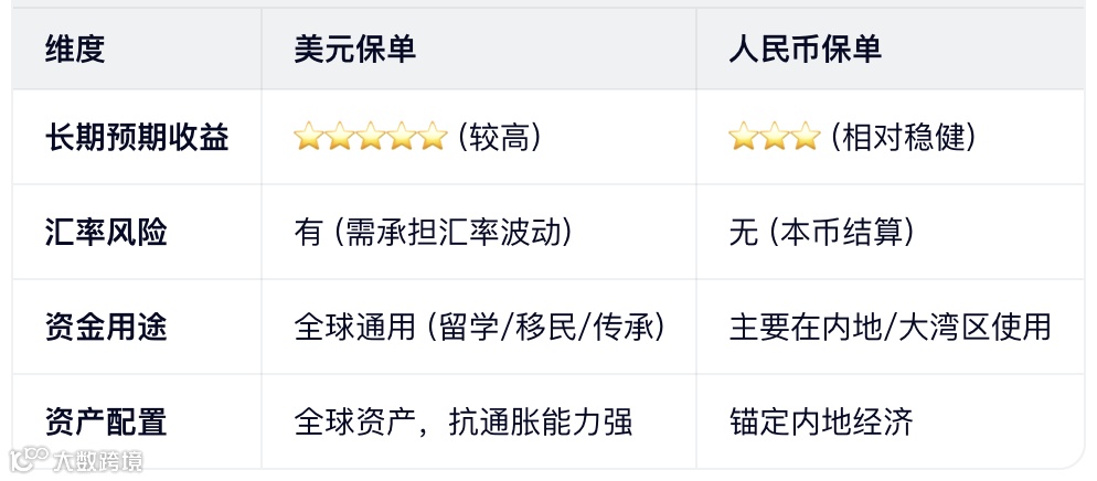 没有绝对的好坏,只有适不适合。美元保单像是“进攻”,帮你博取更高收益,拥抱世界;人民币保单像是“防守”,帮你守住胜利果实,安稳落地。
