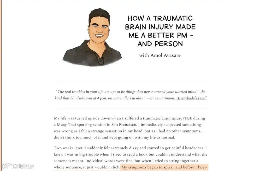 Lenny: 我非常喜欢这个故事。很多人在经历失败时会觉得自己是个骗子,前途尽毁。看到你从关停公司一路走到 Masterclass、Mercury 再到 Anthropic,这非常鼓舞人心。2023年我准备休陪产假时,在时事通讯里征集客座文章。我收到了500多份申请,其中一份就是你的,标题是“一次创伤性脑损伤是如何让我成为更好的产品经理的”。那篇文章让人震撼,请和大家分享一下那段经历吧,这绝对会颠覆大家的认知。