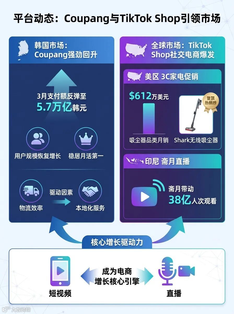 韩国电商平台Coupang在3月表现强劲,支付额回升至5.7万亿韩元,用户规模恢复增长,稳居月活第一。这反映了韩国电商市场的复苏与平台竞争力,可能得益于其物流效率和本地化服务。同时,TikTok Shop在美区推出3C家电品类促销,3月热销榜重构,Shark无线吸尘器登顶,吸尘器品类月销达612万美元,显示社交电商在高端家电品类的爆发力。结合印尼斋月TikTok直播带动38亿人次观看的数据,可见短视频和直播正成为电商增长的核心驱动力。