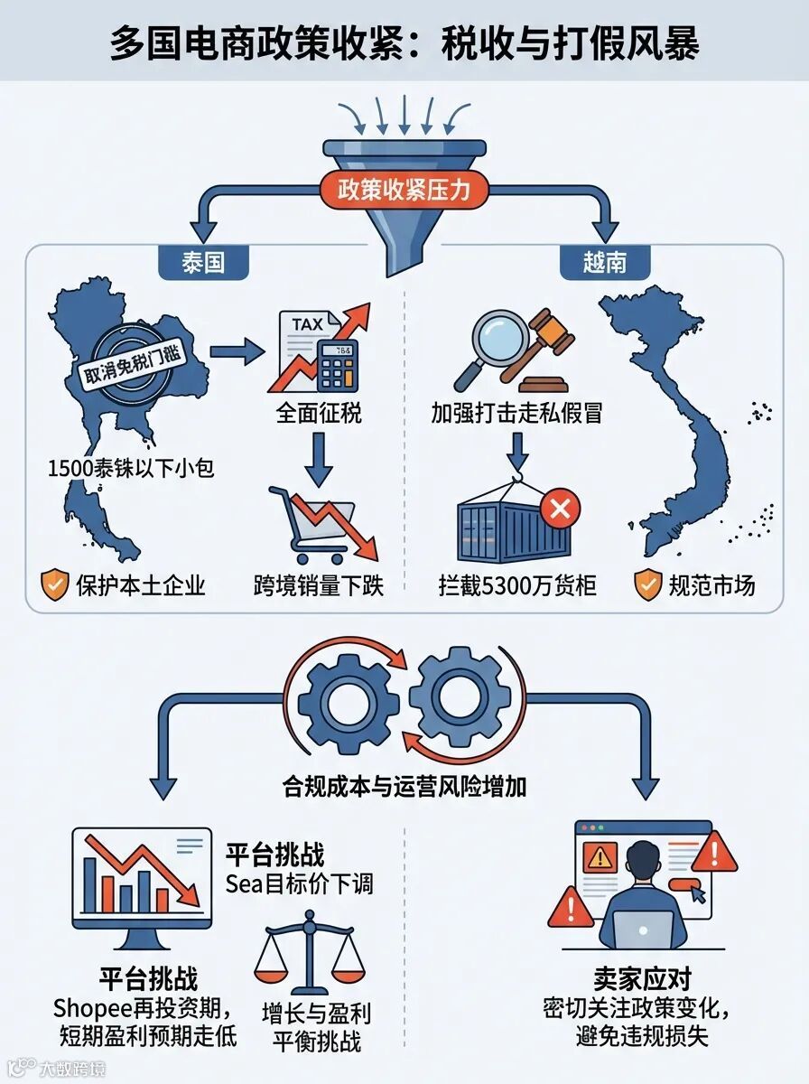泰国海关取消1500泰铢以下免税门槛,对进口小包全面征税以保护本土企业,导致跨境商品销量下跌。越南加强打击电商平台上的走私与假冒商品贸易,涉案5300万的中国进口货柜被拦截。这些政策旨在规范市场,保护本地产业,但增加了跨境卖家的合规成本与运营风险。同时,大和下调Sea目标价,因Shopee处于再投资期,短期盈利预期走低,反映东南亚电商平台面临增长与盈利的平衡挑战。卖家需密切关注政策变化,避免因违规导致损失。