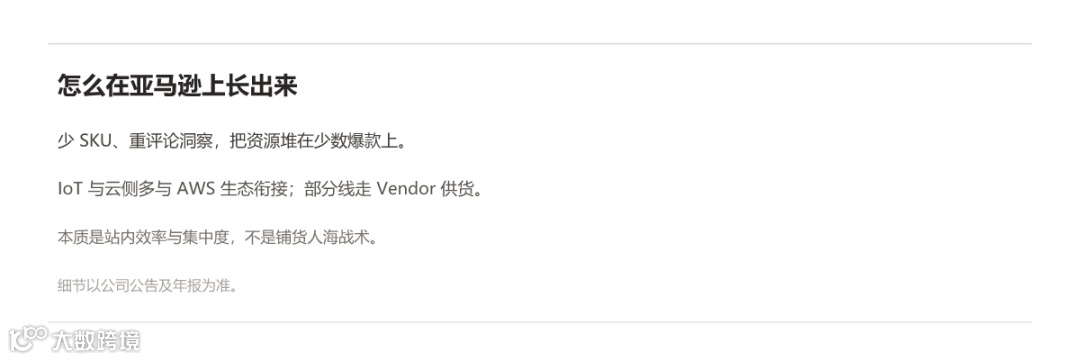 品牌维次不同:在亚马逊搜品类买第一名,和在线下指名买牌,不是一回事。从站内知名到全球公共品牌,还要补全域心智与渠道这一课。