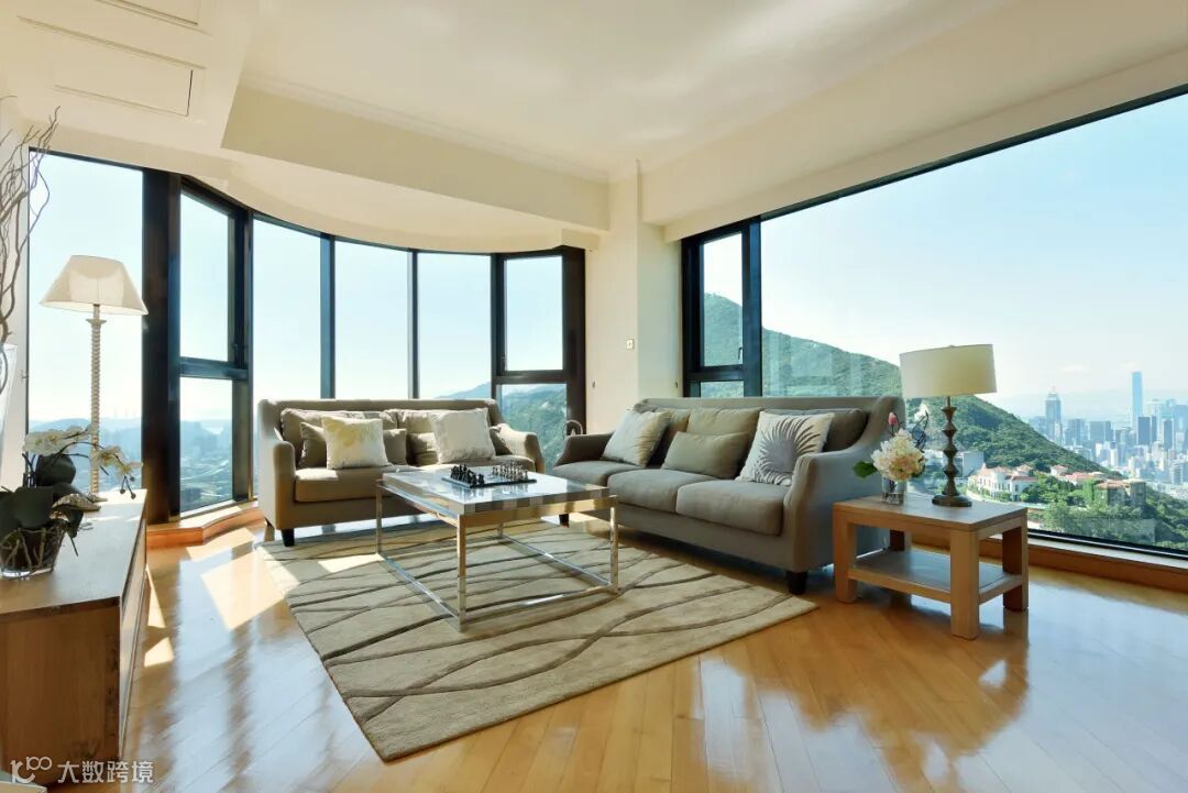 客厅配备超大弧形落地玻璃窗,将窗外山海盛景引入室内。