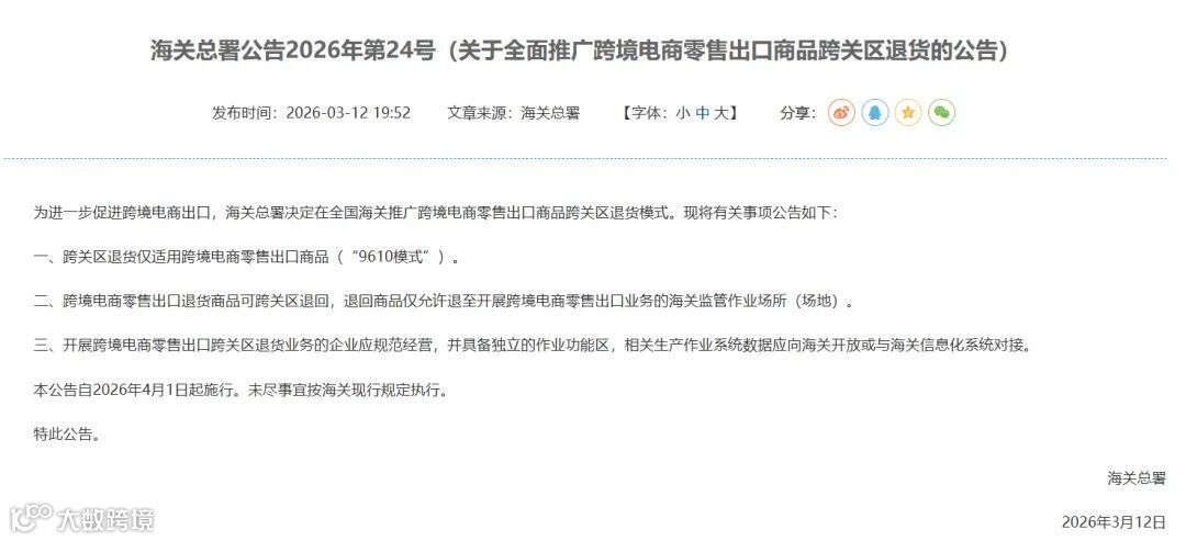 此前,海关总署于2024年12月15日发布的《关于进一步促进跨境电商出口发展的公告》(2024年第167号)明确,在北京、天津、上海、南京、杭州、宁波、广州、深圳、成都、乌鲁木齐等20个业务量大的直属海关开展跨关区退货监管模式试点。经过一年多的试点运行,该模式已验证了监管的可行性,具备全国推广条件。