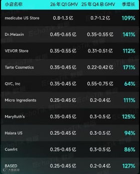 26年Q1季度美国小店medicube US Store以约超1亿美元GMV获取第一名,主美妆个护类目,对比25年Q4季度增加了109%;增长最快的小店Tarte Cosmetics对比25年Q4GMV增长171%。