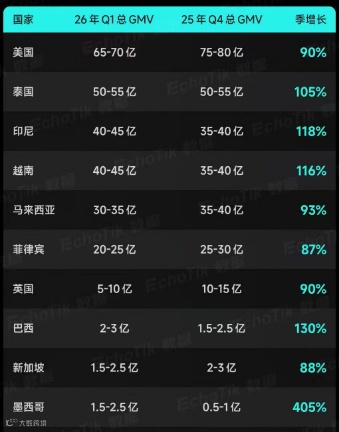 到26年Q1季度美国总GMV约70亿美元位居榜首,对比25年Q4季度墨西哥以405%增长最快。