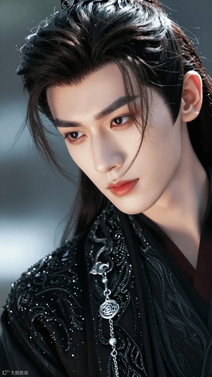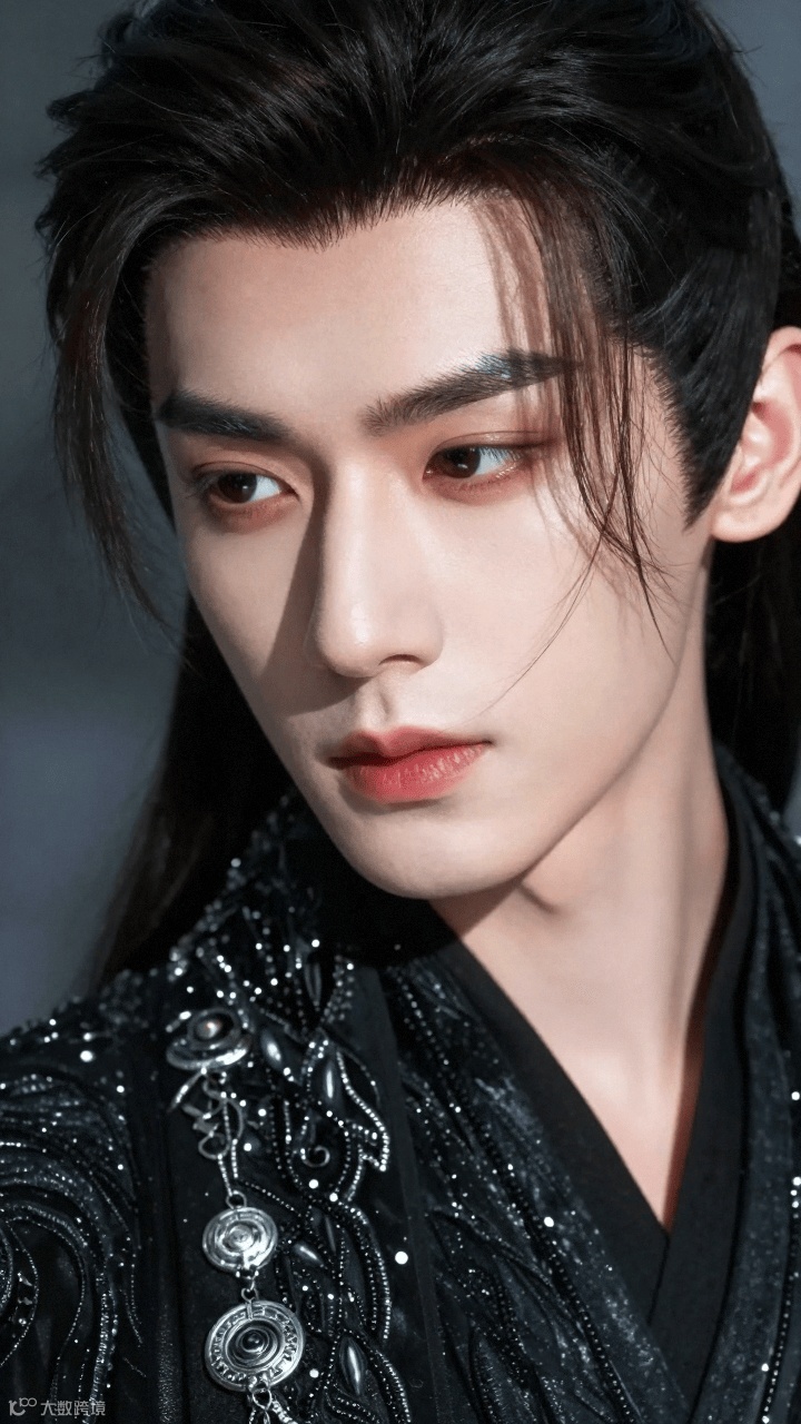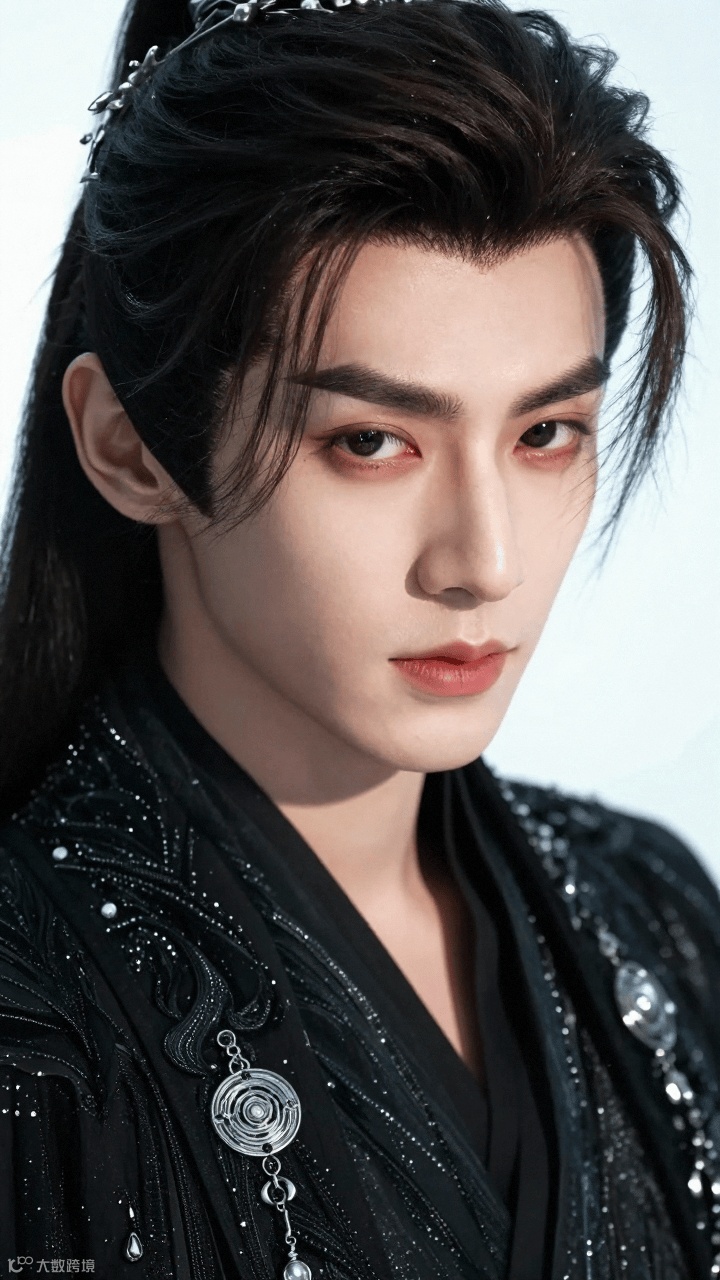 输入"国风帅哥,黑色华丽服饰,发丝细腻,眼尾细长,面部轮廓清晰"等描述后,系统生成图像细节表现突出: