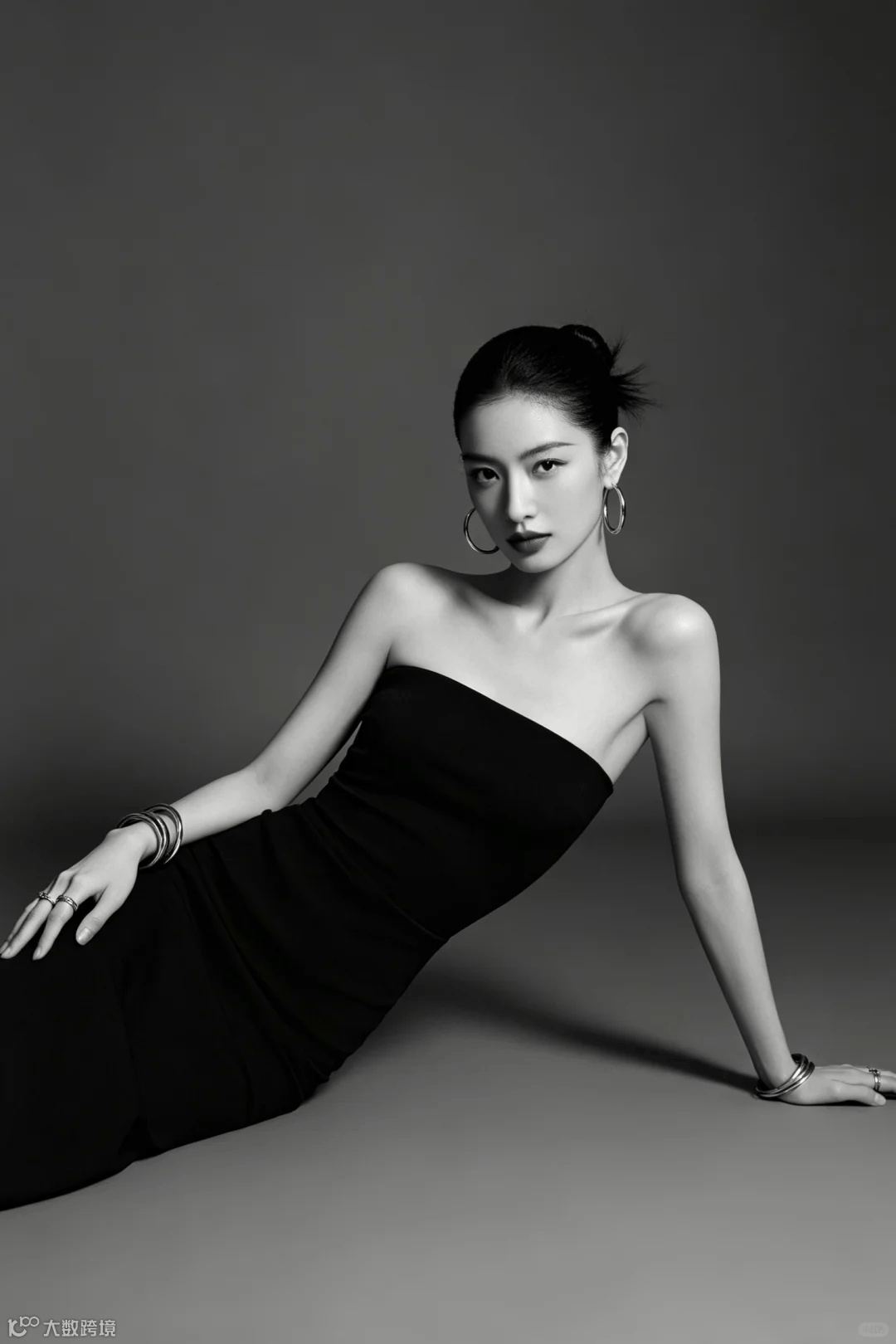 黑白肖像写真,纯色深灰背景,年轻东亚女性,黑色抹胸修身长裙,低盘发,金属大耳圈,侧逆光,极简高级感,杂志大片质感,真实皮肤纹理