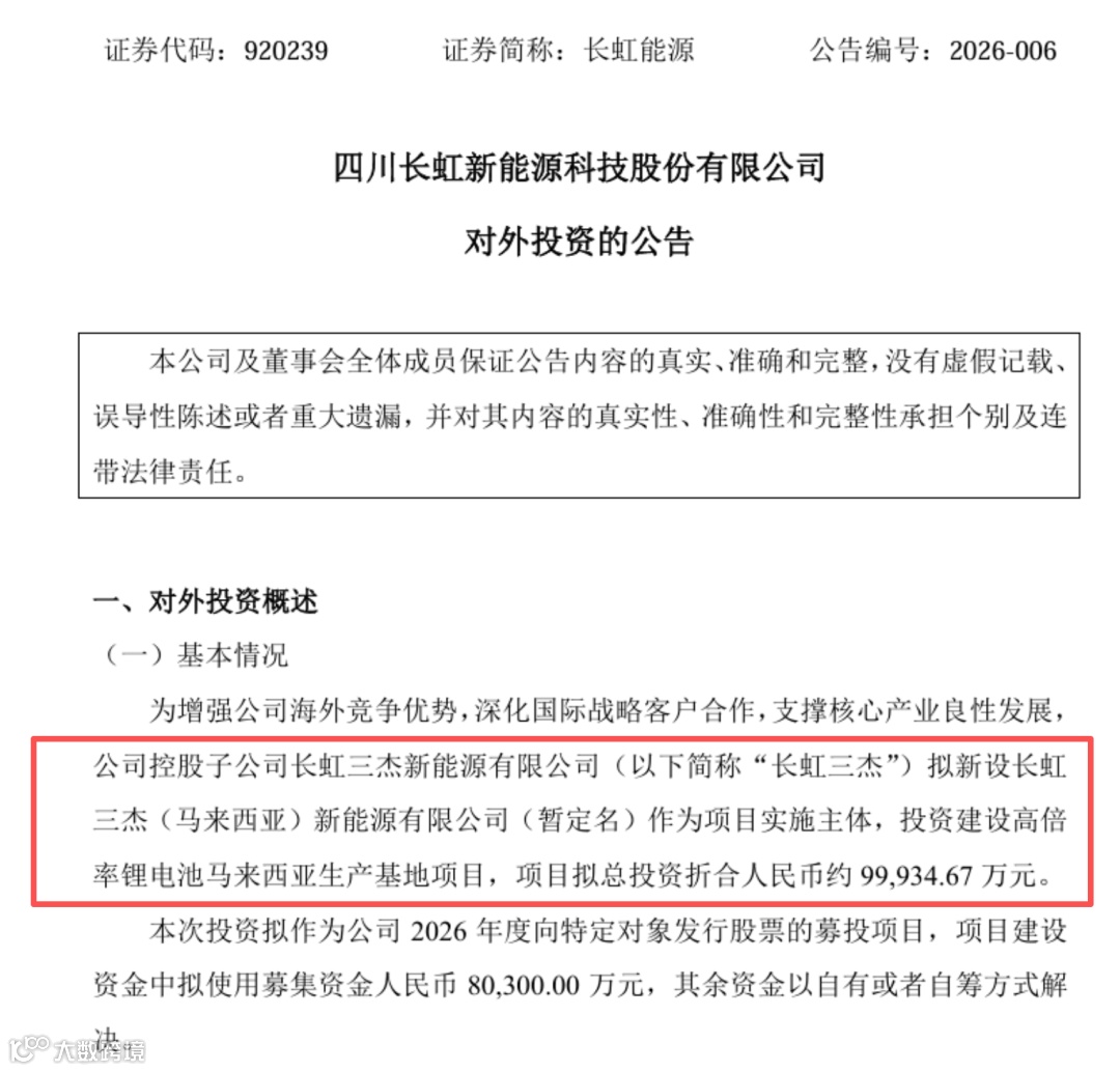 2026年4月3日,四川长虹新能源科技股份有限公司发布对外投资公告。其控股子公司长虹三杰新能源有限公司计划在马来西亚柔佛州投资建设高倍率圆柱锂电生产基地,总投资约9.99亿元,规划年产1.7亿只18650/21700系列电芯。该项目标志着公司正式启动"国内+海外"双基地运营战略,为全球高倍率锂电市场竞争注入新动能。