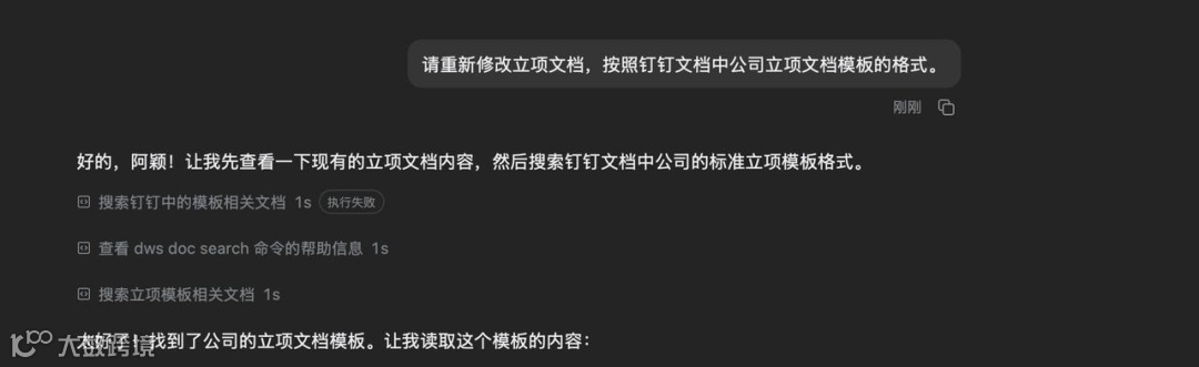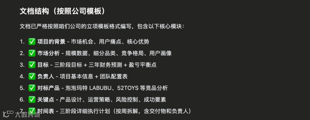 当询问潮玩市场分析时,产品自动触发电商Skill模块,提供供应链视角的专业建议。更值得关注的是系统主动推进工作流——在生成基础文档后,直接询问是否需要优化立项文档并关联钉钉文档。