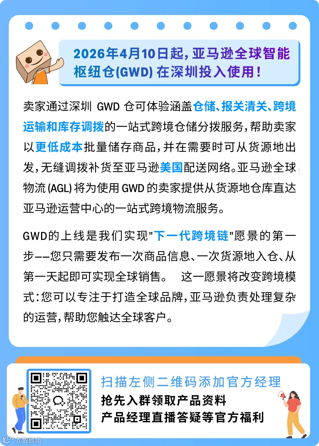 当前深圳GWD仓支持补货至美国FBA,卖家仅需一次国内入仓即可依托亚马逊网络开展美国站点销售,正式开启"下一代跨境链:国内入仓,开售即全球"战略实践。