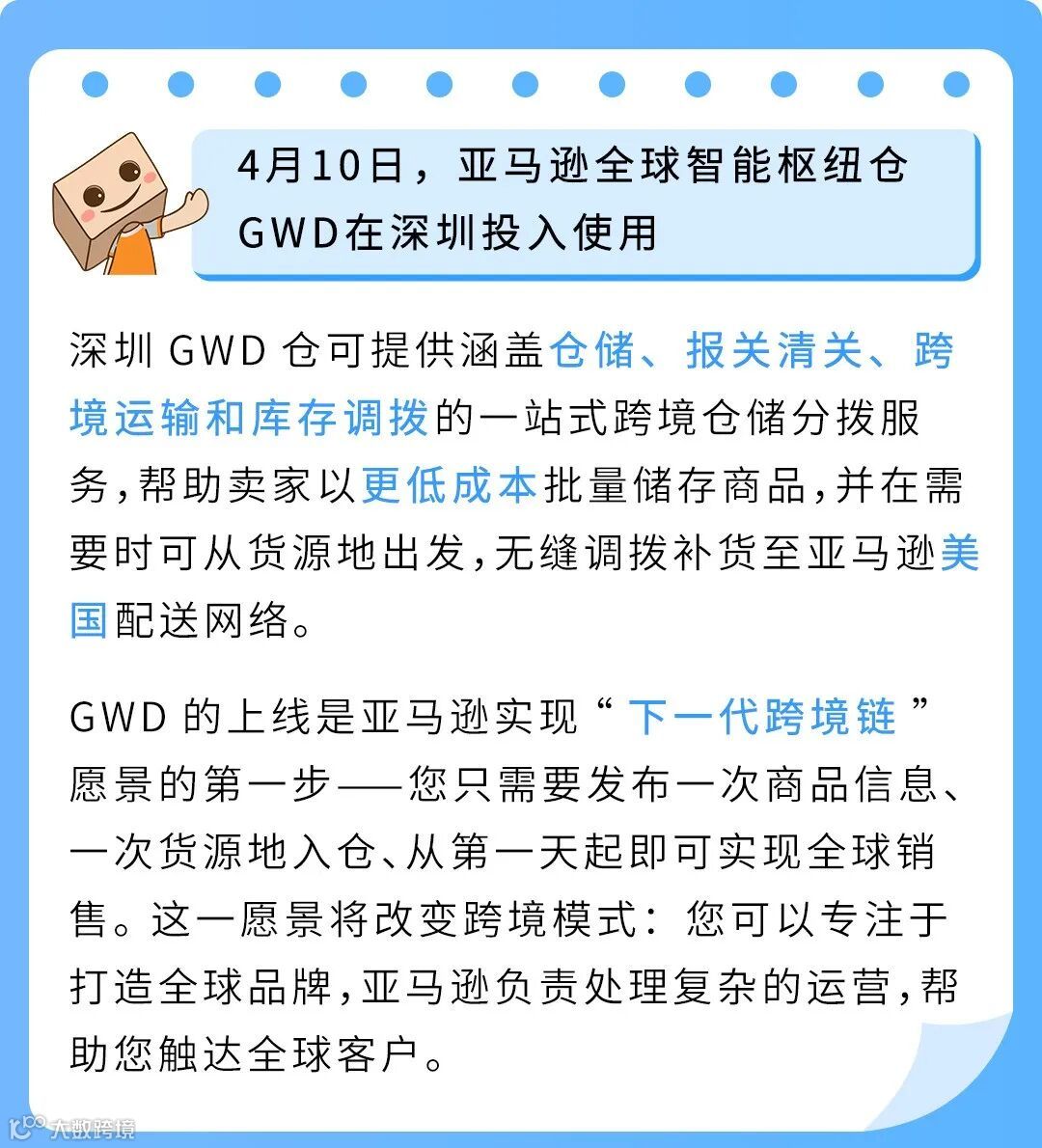 深圳GWD仓当前仅支持美国FBA补货,卖家通过一次国内入仓即可依托亚马逊网络拓展业务。作为"下一代跨境链:国内入仓,开售即全球"战略首站,未来将扩展更多货源地仓及销售国,最终实现"一个库存池触达全球"目标。