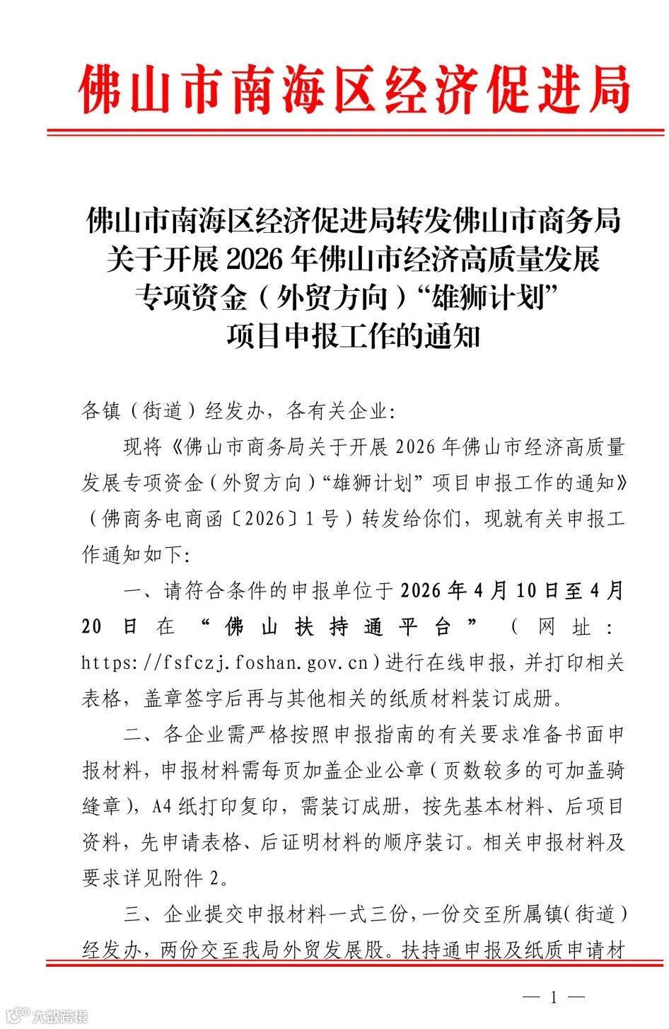 关于开展 2026 年佛山市经济高质量发展专项资金(外贸方向)“雄狮计划”项目申报工作的通知