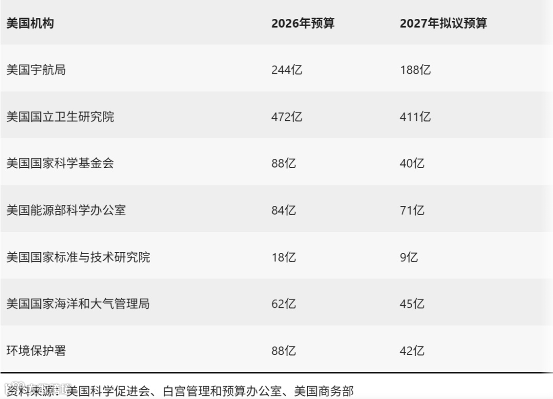 美国宇航局(NASA)总预算拟削减23%,科学部门经费将锐减47%,几近腰斩。美国行星协会太空政策主管凯西·德雷尔指出:"这将严重削弱NASA的太空探索领导力。"国家科学基金会(NSF)预算遭砍55%,降至40亿美元;能源部科学办公室削减15%至71亿美元;国家卫生研究院(NIH)削减12%至414亿美元;环保署(EPA)削减52%至42亿美元;国家海洋和大气管理局(NOAA)拟削减27%。