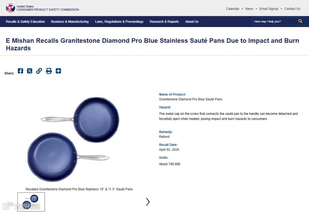 近日,美国消费品安全委员会(CPSC)紧急召回约74万件中国产Granitestone Diamond Pro蓝色炒锅,引发跨境电商行业高度关注。