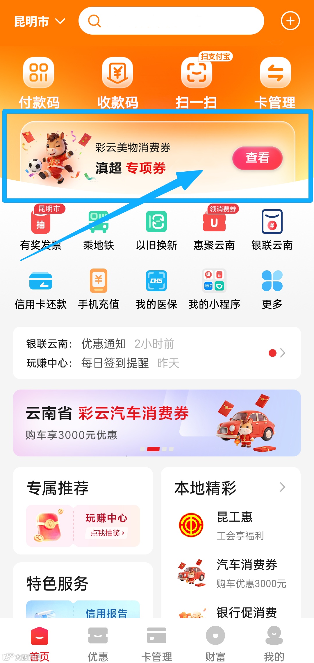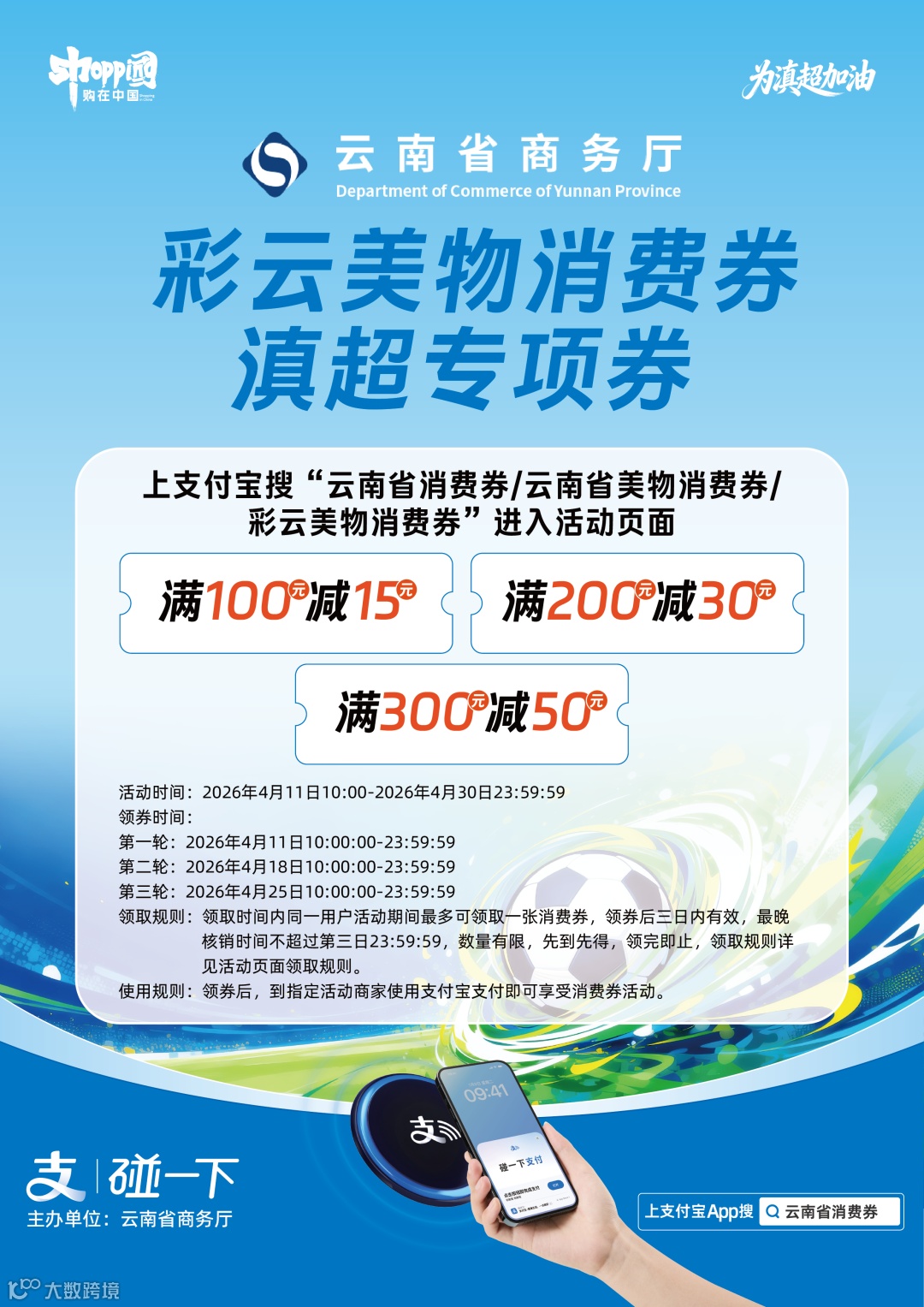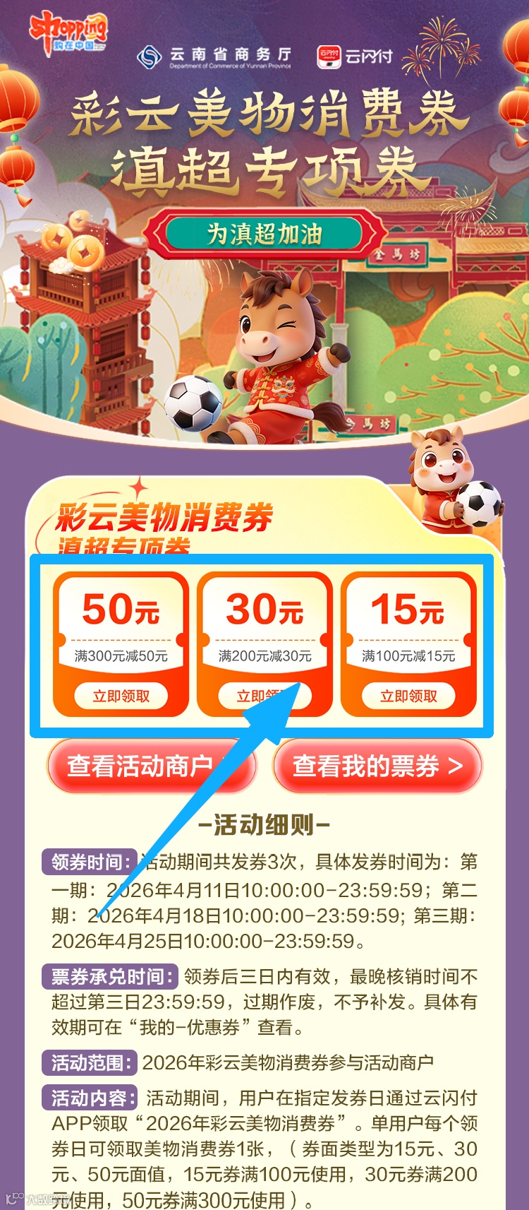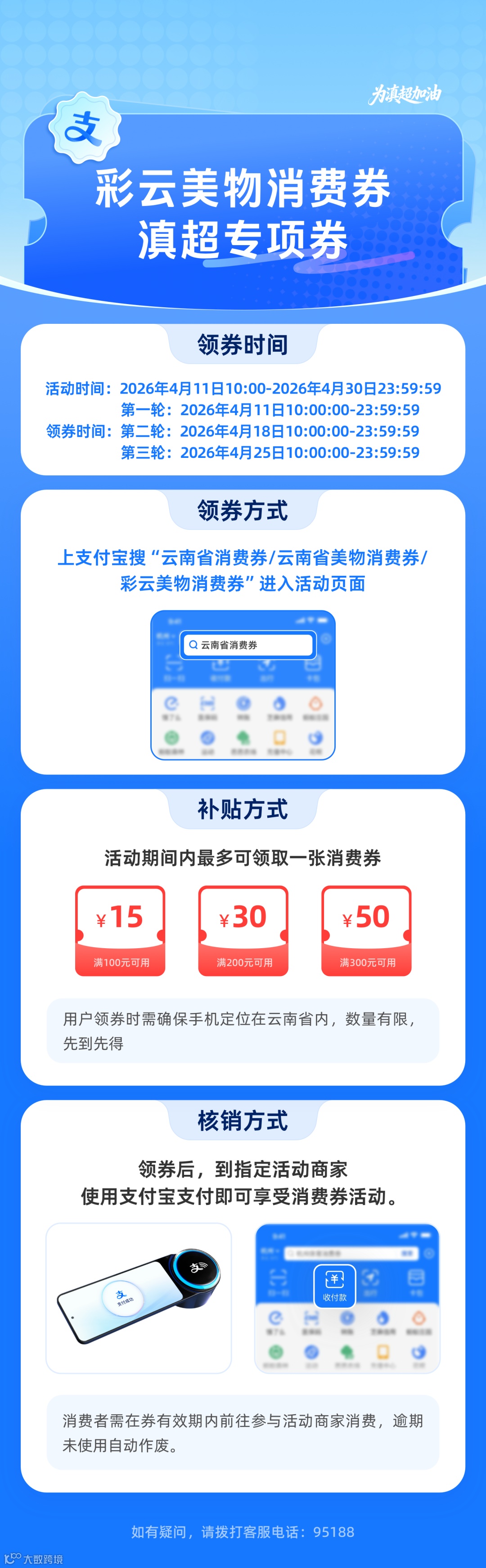 第三期彩云美物消费券滇超专项券分三轮发放,时间为2026年4月11日、18日、25日每日10:00-24:00,数量有限先到先得。