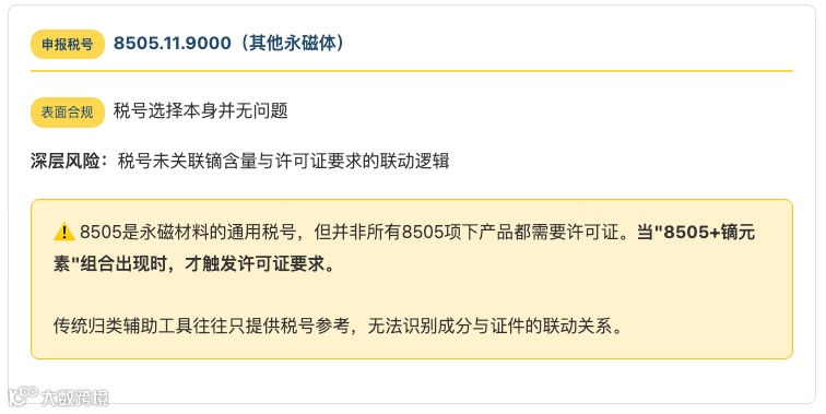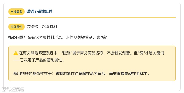 出口报关单品名标注"磁钢"和"磁性组件"并申报为非管制物项,但海关实验室检测发现镝含量触发管制要求,导致货物需额外许可证。本文通过真实案例,剖析两用物项出口的三大合规难题及AI解决方案。