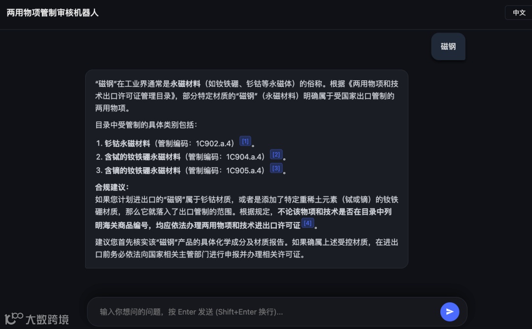 两用物项出口管制本质是信息不对称博弈:企业了解产品却可能忽略规则细节,海关掌握政策却难逐票核查成分。AI工具消弭这一鸿沟——当"磁钢"数据被深度解析,0.1%镝含量不再是隐患,而是可前置识别的合规风险点。