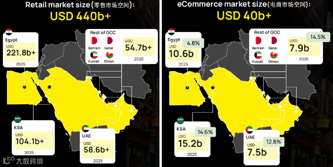 中东是全球电商增长最快的区域之一,沙特作为核心潜力市场,电商规模超440亿美元,零售市场达4400亿美元。年轻消费群体占比高、购买力强劲,对中国商品需求旺盛。