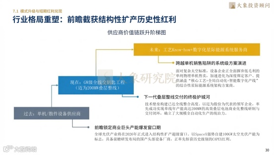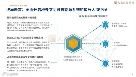 短期行业向系统级方案服务商转型,头部企业以叠层整线交付构筑壁垒,2026年结构性扩产将带动订单爆发,实现业绩与估值双击。长期晶硅-钙钛矿叠层技术将成为星际能源底座,2035年后GW级太空数字枢纽落地,光伏从地表发电机升维为深空文明基础设施,开启产业范式革命性变革。