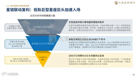 太空光伏成最大增量引擎,AI算力爆发驱动太空数据中心落地,-270℃无源散热特性使10年综合成本较地面骤降95%。SSO轨道实现近全天候发电,量级达地面5-12倍,突破间歇性瓶颈,升级为稳定基荷电源。低轨巨型星座申报超10万颗,星链等巨头规划百GW级太空光伏产能,卷展式太阳翼、超薄HJT电池及银包铜技术协同优化发射载荷,催生超2万亿太阳翼市场,设备应用边界从地面延伸至星际能源载体。
