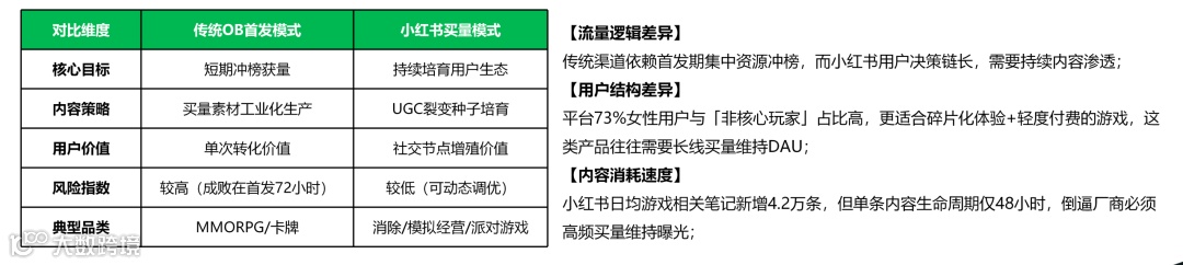 该游戏面临三大挑战:首先,小红书游戏投放仍处行业摸索期,传统短平快转化逻辑难以匹配平台长决策周期特性;其次,平台强内容属性需持续产出本土化素材,而新品缺乏现成内容库,测试成本难以预估;最关键的是,小红书70%以上用户为女性,与SLG男性策略玩家的核心付费人群存在显著错位。