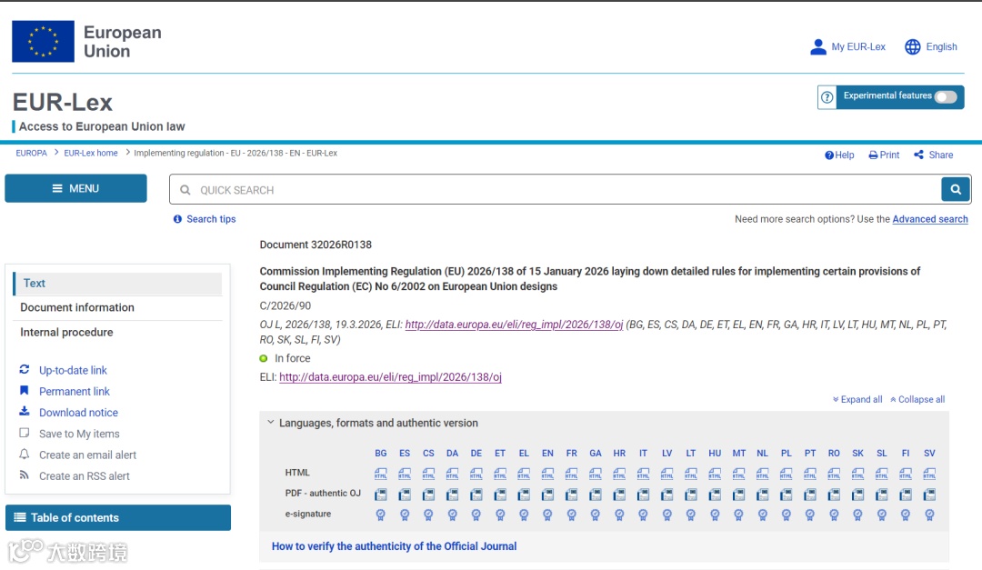 近日,欧盟委员会正式批准《欧盟外观设计实施条例》(第2026/138号),作为外观设计改革的核心补充,该条例对外观设计申请形式、优先权要求及程序规范进行全面升级。条例已于2026年3月19日发布,将于2026年7月1日正式施行。