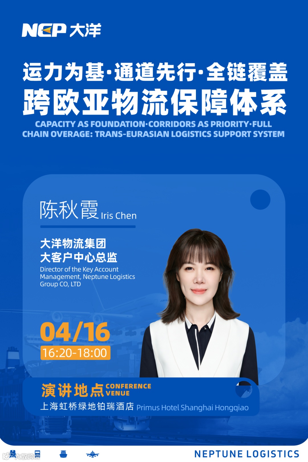 4月16日16:20-18:00,大洋物流集团大客户中心总监陈秋霞将进行《运力为基·通道先行·全链覆盖——跨欧亚物流保障体系》主题演讲。