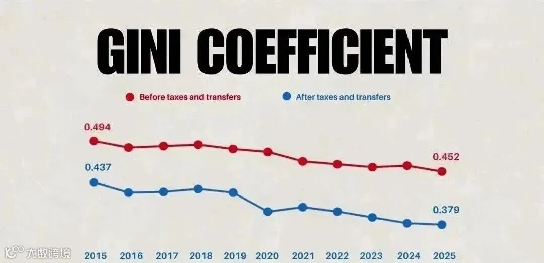 财政部首次公布的财富基尼系数达0.55,远高于2023年收入基尼系数0.452(计入政府调节后降至0.379)。基尼系数越接近1表明差距越大,数据揭示财富差距较收入差距更为突出——收入是短期现金流,而财富积累具有长期复利效应。