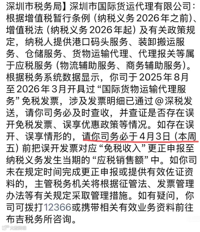 2026年4月初,深圳市税务局联合海关、外汇管理部门启动货代行业专项核查行动,要求企业于4月3日前完成自查、更正申报及补税。本次核查覆盖全市国际货运代理企业,追溯近8个月(2025.8—2026.3)业务数据,标志着行业从野蛮生长进入合规发展新阶段。