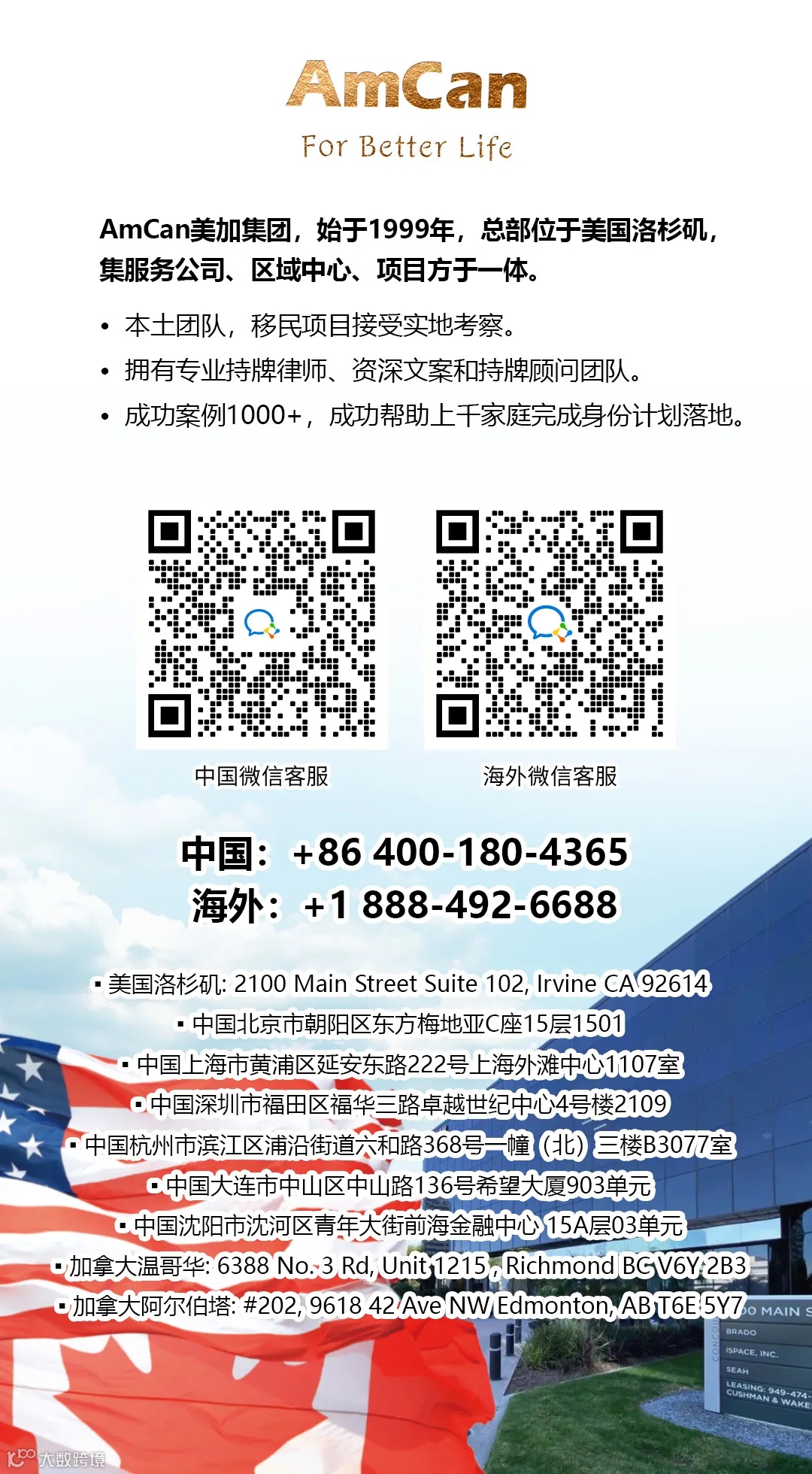 AmCan美加集团拥有27年美国、加拿大等主流国家移民服务经验,提供一站式移民解决方案。集团配备持牌移民顾问、商业分析师及创业导师团队,以高成功率和政策敏锐性著称。
