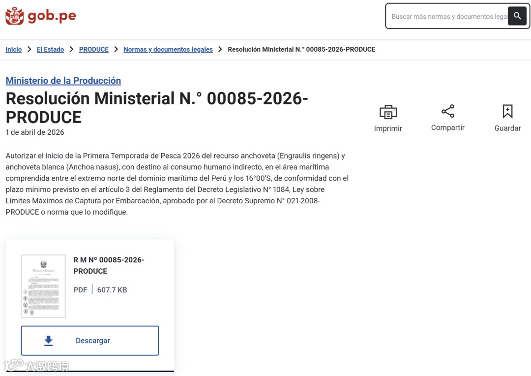 秘鲁生产部正式批准2026年首个鳀鱼捕捞季,捕捞范围覆盖中北部海域至南纬16度,对象为鳀鱼与白鳀鱼两类资源。